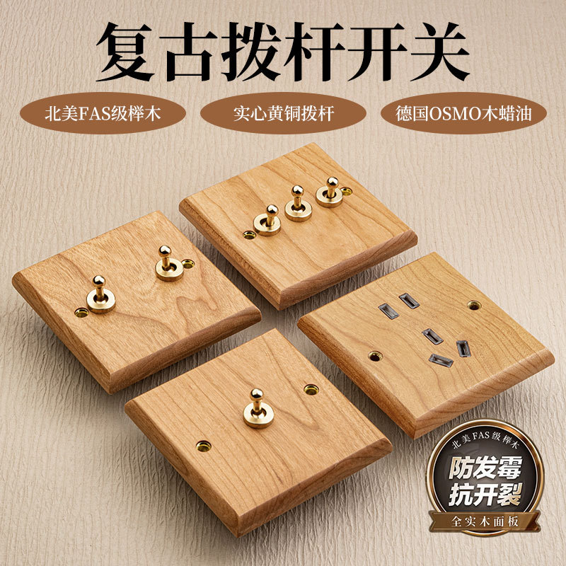 European style retro plug-in Nordic style solid wood 86 switch socket panel copper lever beech wood log color