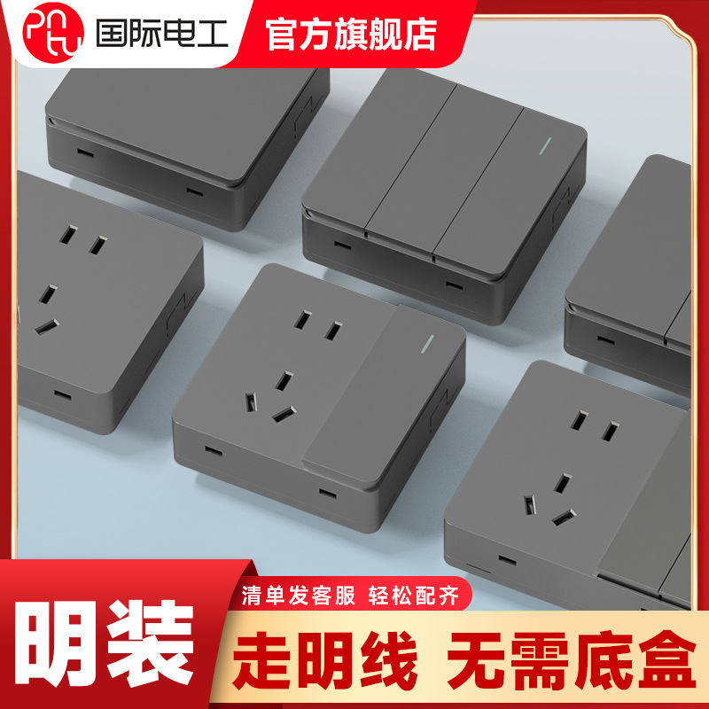 Open-mounted switch socket International Electrical gray wall open wire ultra-thin one-open five-hole ten-hole household multi-hole socket