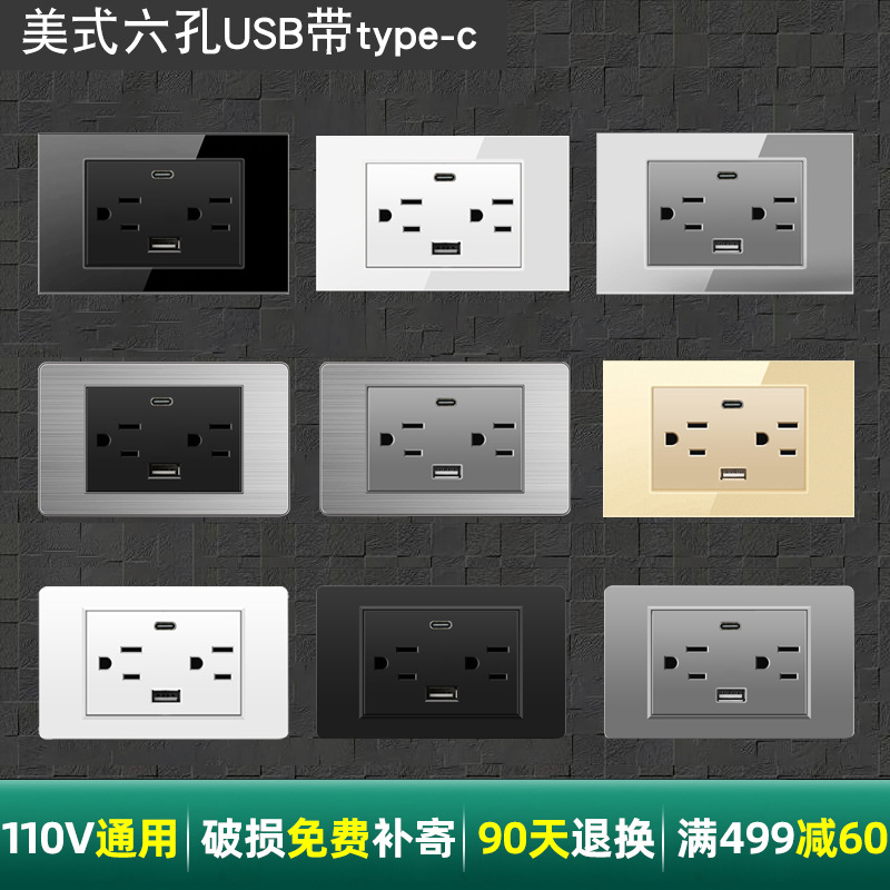 110V Taiwan Socket USB with Type-C American Standard 15A Wall Power Switch Panel American Standard Six-Hole Charging Plug