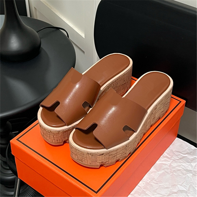 Genuine Leather Wood Grain Thick Bottom H-Loving Slippers Women's Summer Wedge Heel Slippers Small Height-Increasing Beach Sandals