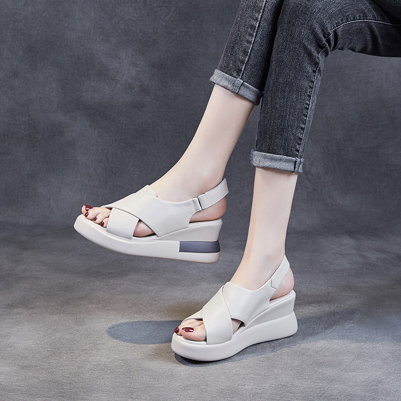 Soft Leather Wedge Sandals Women's 2024 Summer New High Heel Open Toe Fairy Style All-match Thick Bottom Platform Crossover Sandals