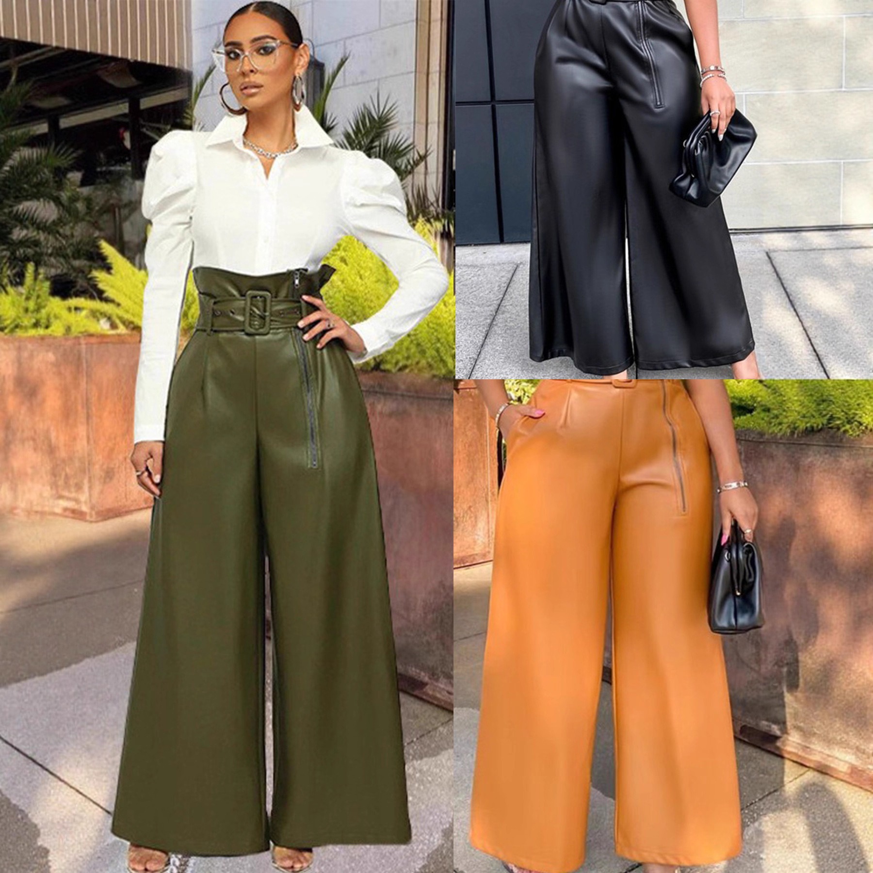 2021 Winter New Women's Clothing European and American Fashion High Waist PU Leather Pants INS Style Night Shop Metal Belt Wide Leg Pants