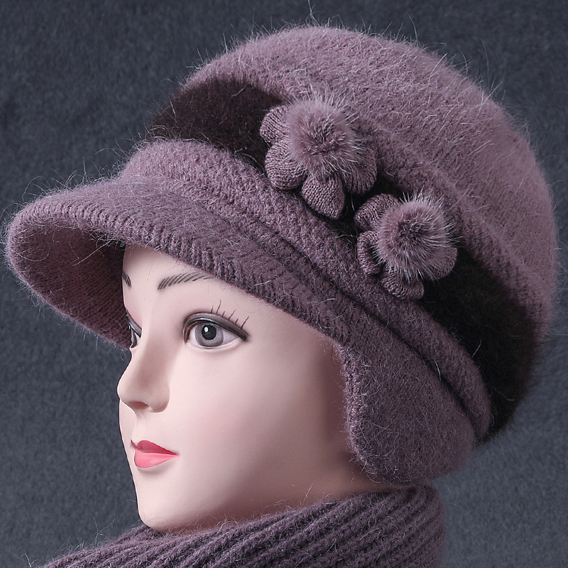Women's rabbit fur knitted warm cap for middle-aged and elderly grandma fleece-lined cold-proof wool ear protection cap fashion mother