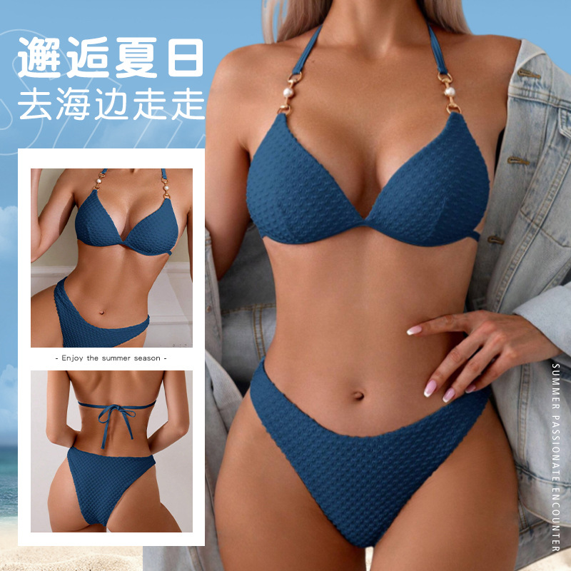 European and American Women's New Swimwear, Sexy Hard Cup Printed Bikini Set, Spaghetti Strap, Backless, Slimming, Solid Color