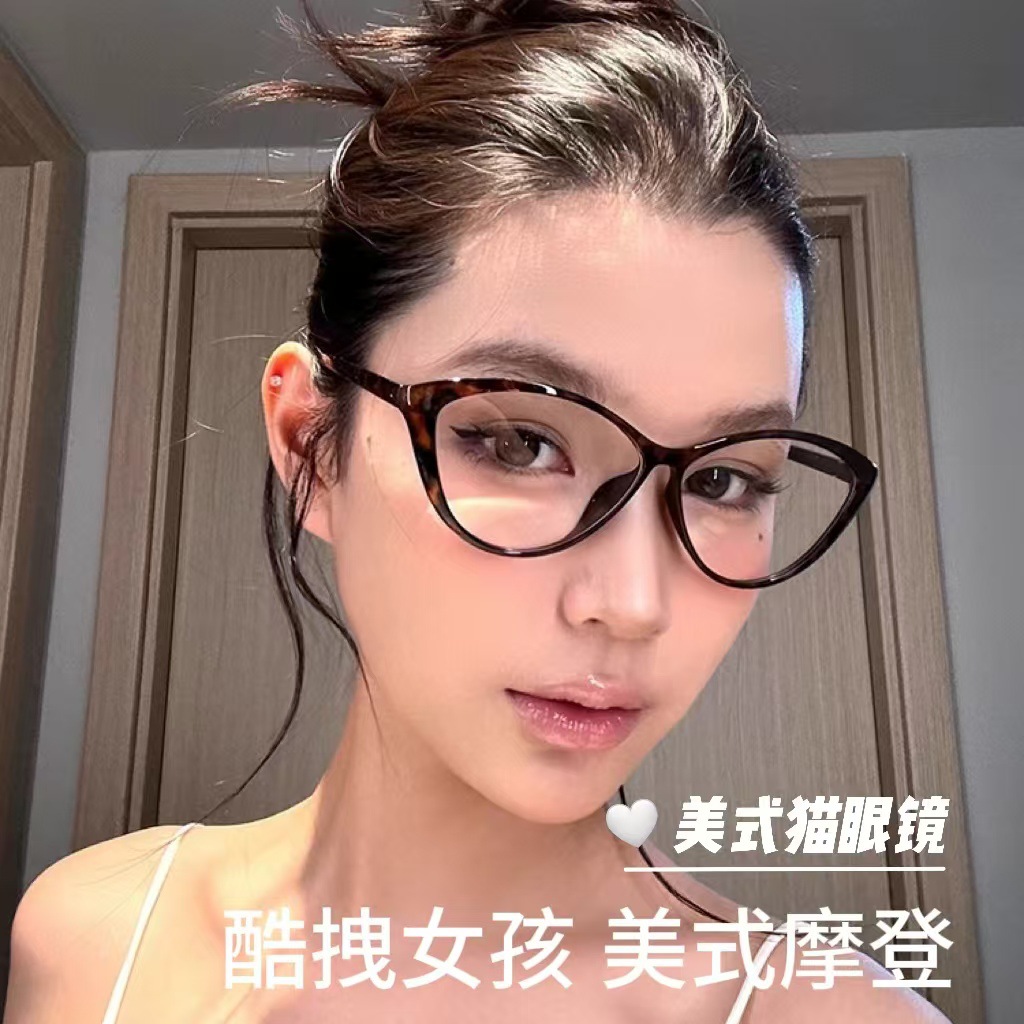 European and American Spice Girl TR90 Ultra Light Cat Shaped Myopia Glasses Black Frame Women's Plain Retro Modern Anti-Blue Light Flat Frame
