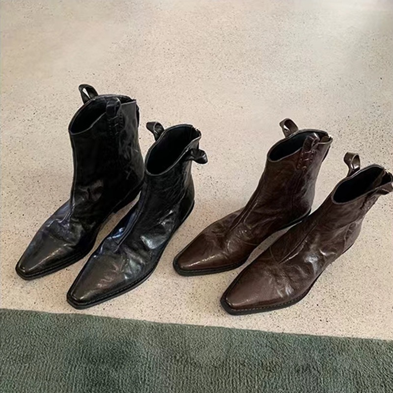 Grape Mom's Same Style Fashionable Pointed Toe V-Mouth Retro Denim Genuine Leather Slim Boots Thick Heel Wrinkled Western Short Boots for Women Autumn
