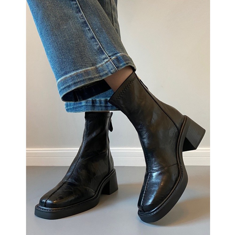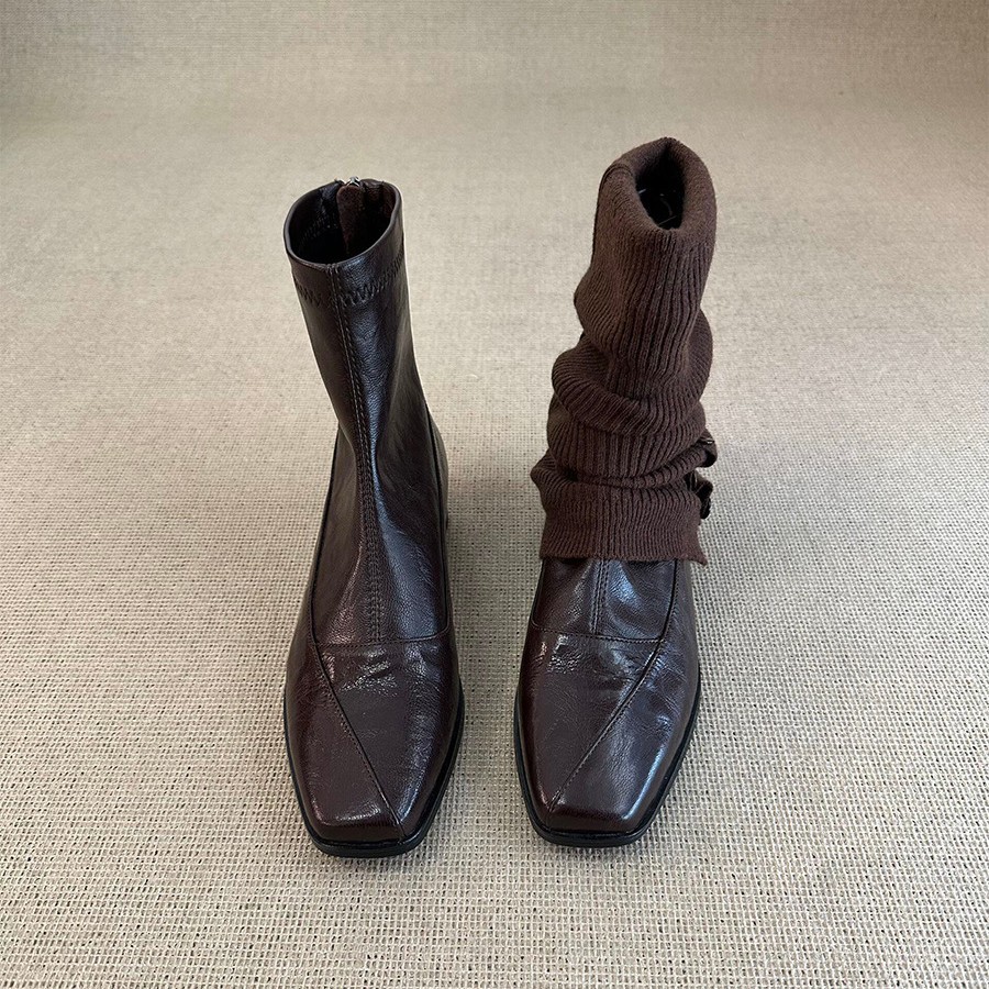 Soft Leather Version ~ Retro Square-Toe Short Boots, Slimming Look Back Zipper, Work Clothing Elegant, Thick Heel, Elastic Slim Boots, Women's Boots
