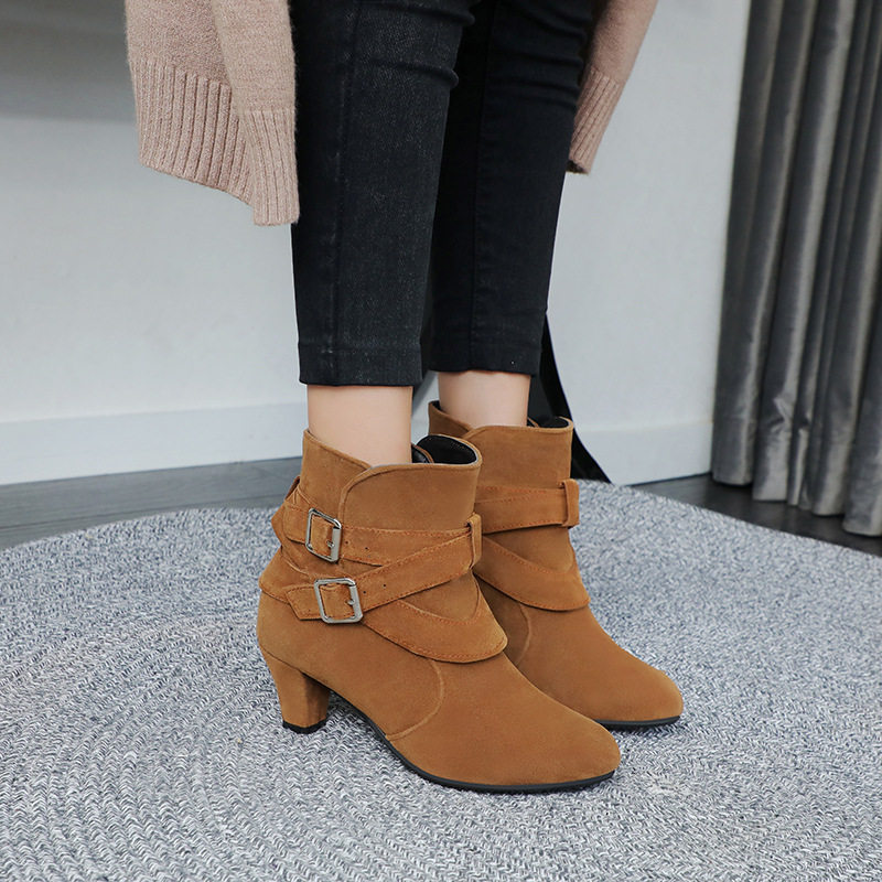 33-43 Foreign Trade Cross-border Autumn and Winter Size Women's Boots Belt Buckle Middle Heel Suede Sleeve Simple Ankle Boots H211