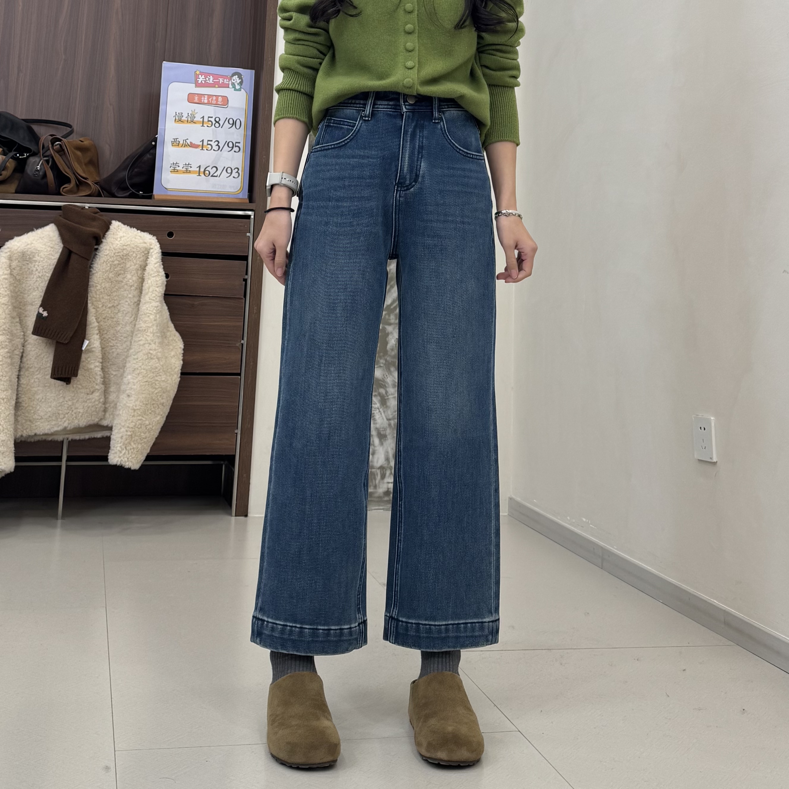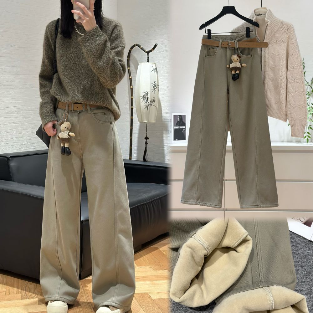 【Qianqianjia Women's Clothing】Autumn and Winter Korean Style High-Waisted Slimming Straight-Leg Wide-Leg Pants Retro Fleece-Lined Jeans