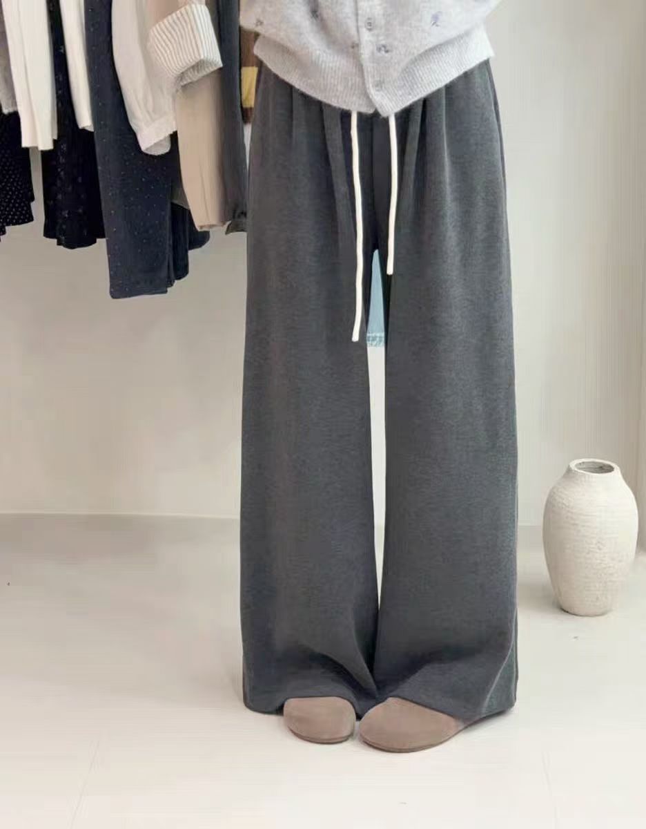 E+1 Winter 25266 New Korean Style Simple Drawstring Flower Bud Waist Fleece-Lined Cashmere Straight-Leg Pants Wide-Leg Casual Pants 2526