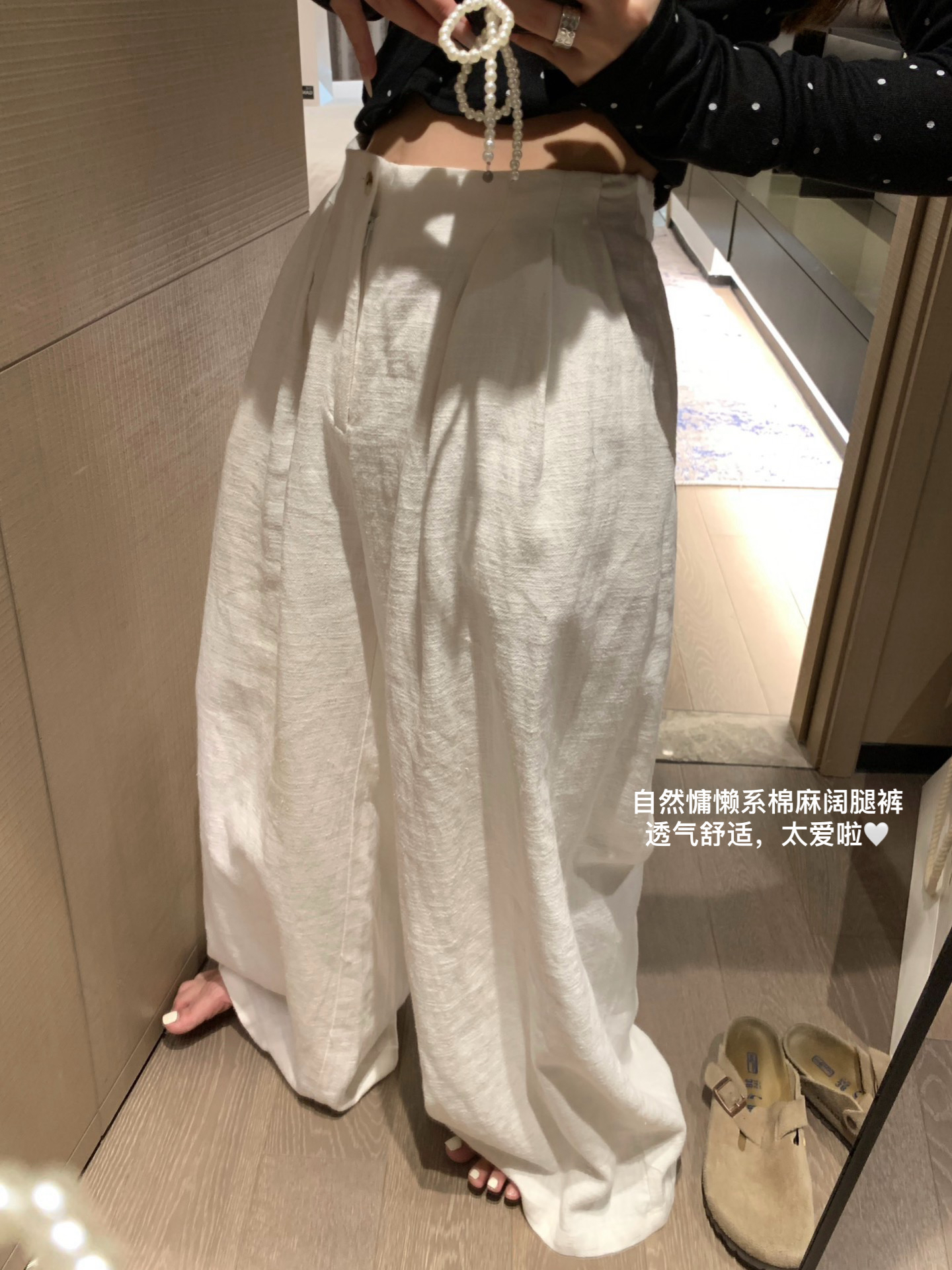 Lazy Old Money Style White Linen Wide-Leg Pants for Women, Summer High-Waisted Loose Slimming Drapey Casual Straight-Leg Floor-Length Pants