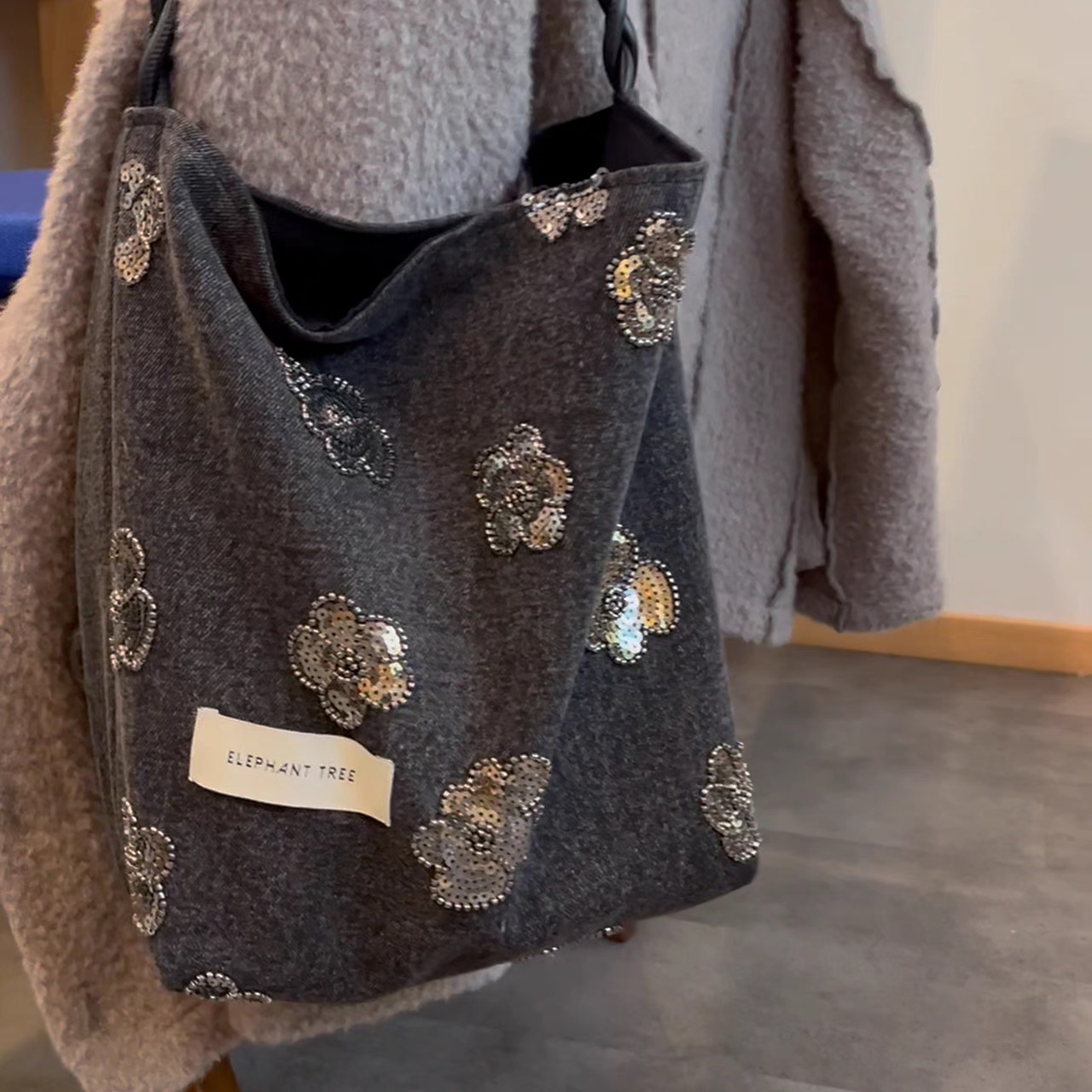 Trendy Sequin Denim Versatile Women's Shoulder Bag Canvas Hobo Underarm Bag Large Capacity Niche Autumn and Winter Tote Bag