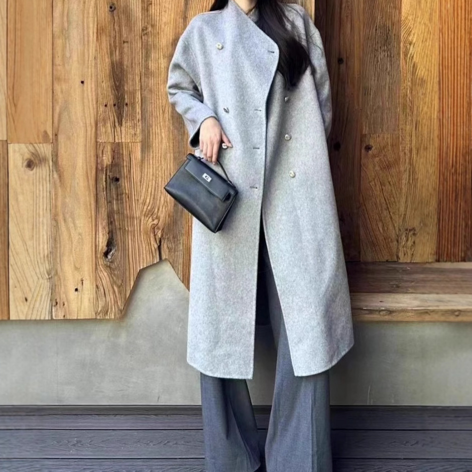 Max's Same Style Korean Design Double-Breasted Fashionable Versatile Stand-Up Collar Double-Sided Wool Long Coat for Women