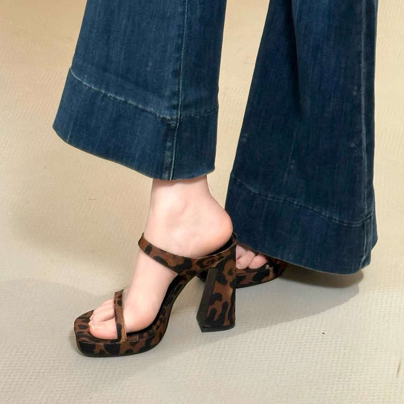 New mid heel versatile Korean style sandals high heel women's summer crystal leopard print outerwear women's square heel chunky heel sandals