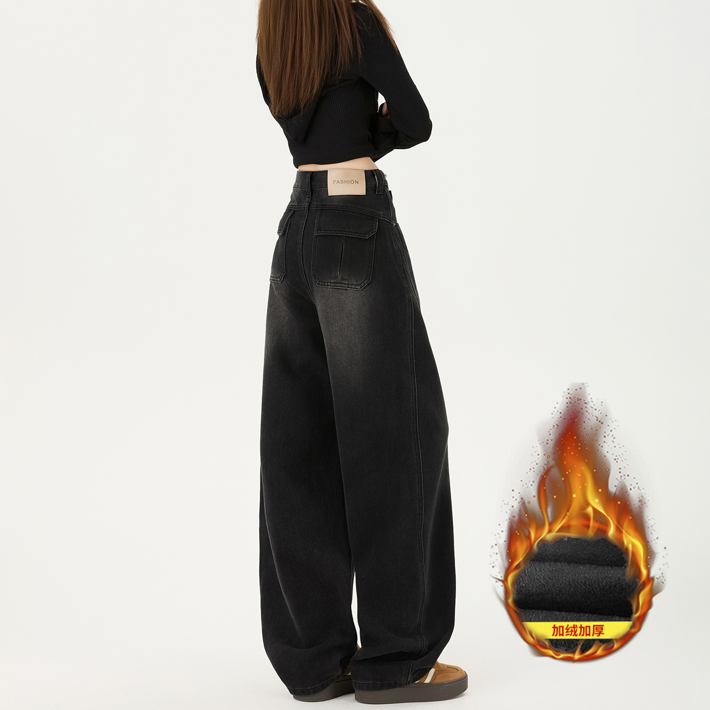 Black and Gray Scimitar Wide-Leg Jeans for Women 2025 Autumn and Winter Fleece-Lined Warm Loose High-Waist Draped Versatile Floor-Length Pants