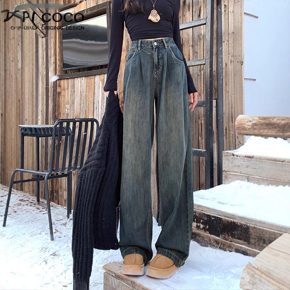 Mu Hanshe 2025 American Wide-Leg Denim Women's Autumn and Winter Velvet Narrow Straight Blue Pants for Women