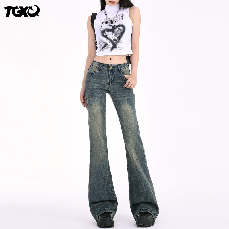 Tgxq Retro Flared Jeans for Women 2025 New American Style Spicy Girl Elastic Petite Low-Waist Bell-Bottom Pants
