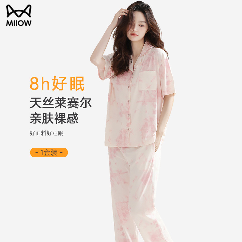 Cat-Themed Women's Pajamas, Summer 2025 New Model, Lyocell Cotton Short-Sleeve Long Pants, Pink Floral Loungewear Set for Summer