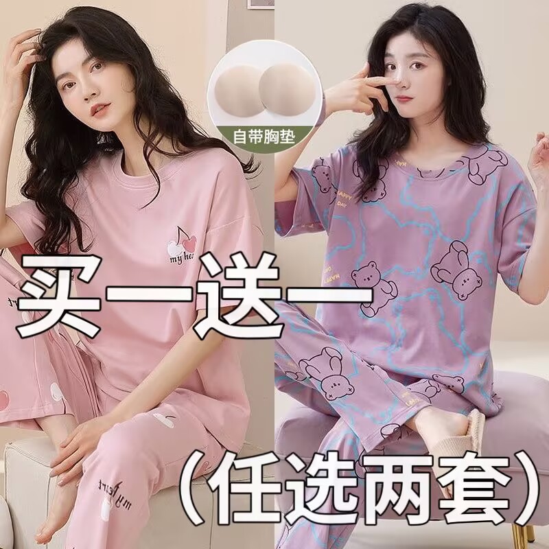 100% Cotton Pajamas with Breast Pads for Women Summer Short-Sleeved Pants Cartoon K-Style Can Be Worn Outside Women's Home Clothes Set