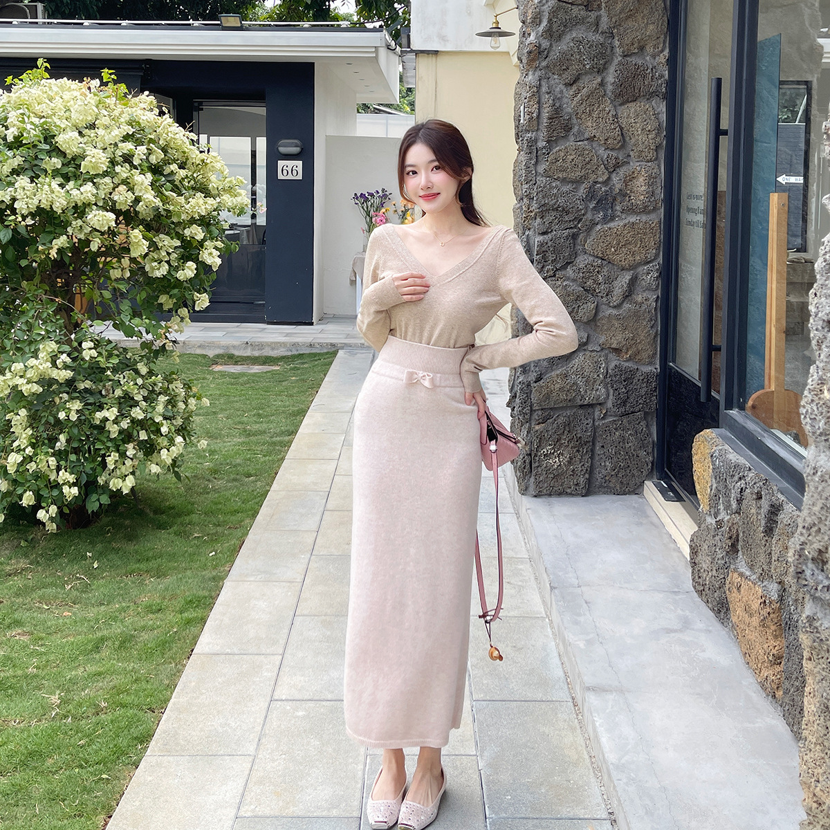 Ready Stock Girly Wool Inner Wear Set V-Neck Base Shirt Sweater Women's Autumn Fashion Slim High-Waisted Skirt Set