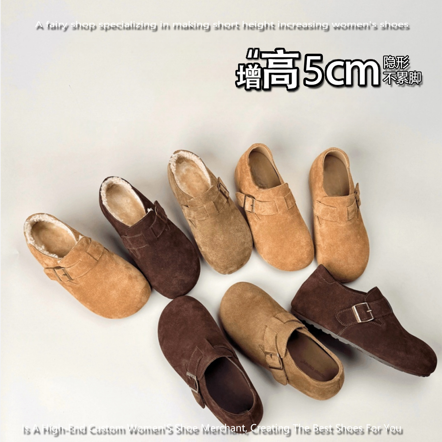 Lan Guai 2025 New Autumn and Winter Invisible Height-Increasing Genuine Leather Birkenstock Shoes with Plush Lining, Versatile Warm Cotton Shoes for Women