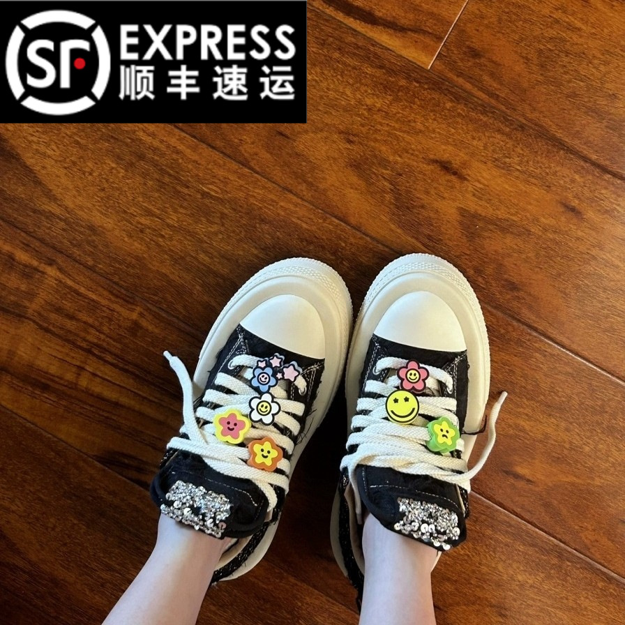 FORESHADOW Zhao Ruth Tweed DIY Smiley Hanging Decorations Thick-soled Casual Board Shoes Flower Canvas Shoes
