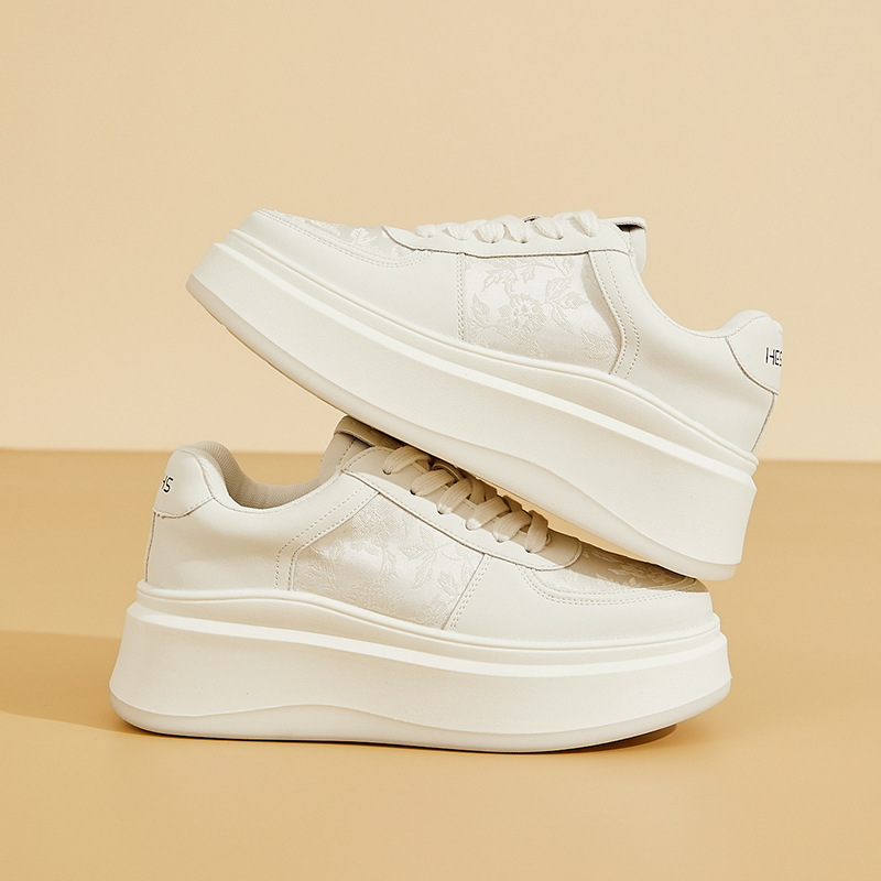 Chinese Style Embroidered Genuine Leather White Shoes for Women, Versatile Lightweight Platform Shoes for Small People, Thick-Soled Sports and Leisure Sneakers