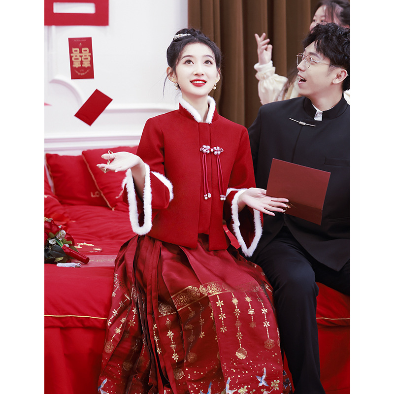 Red vest dress bridal wedding toast dress engagement dress women's autumn and winter dress Chinese style two-piece thickened dress