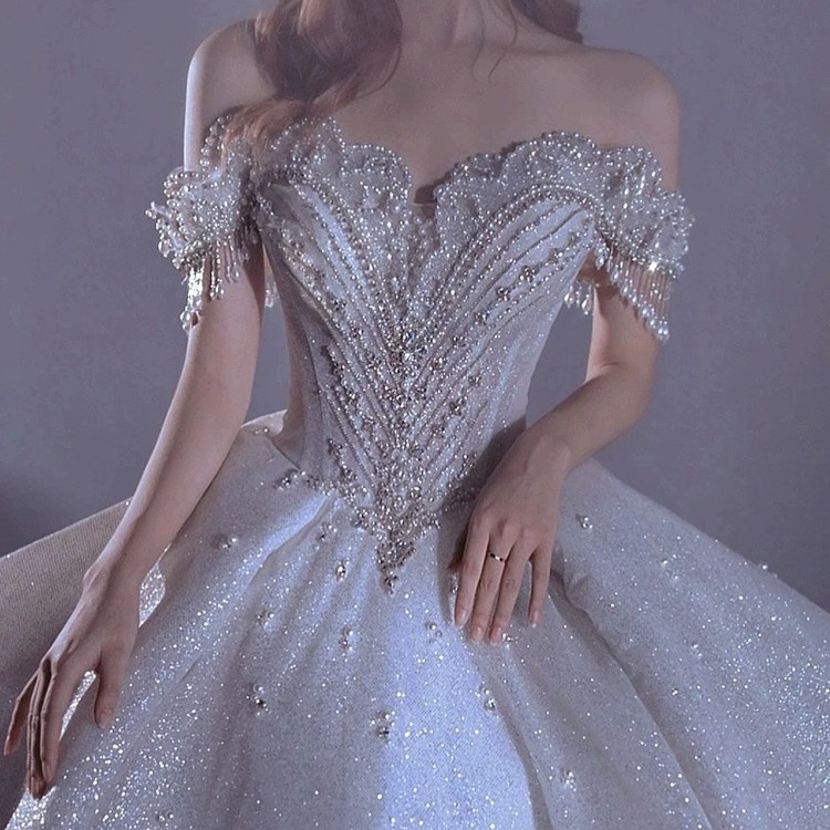 French One-Shoulder Starry Sky Wedding Dress for Women 2025 New Bride Small Main Yarn Heavy Industry Luxury Palace Style