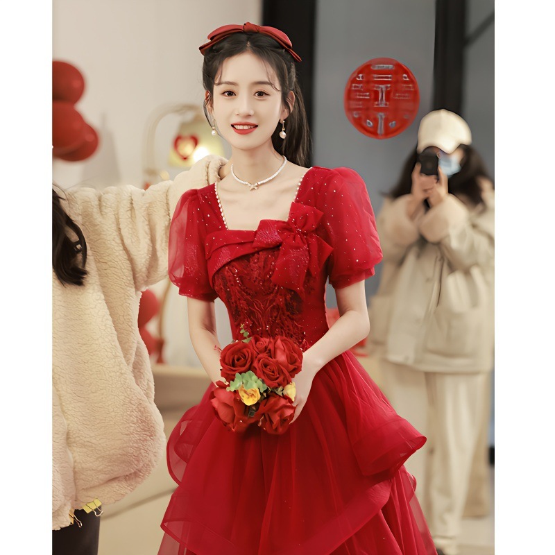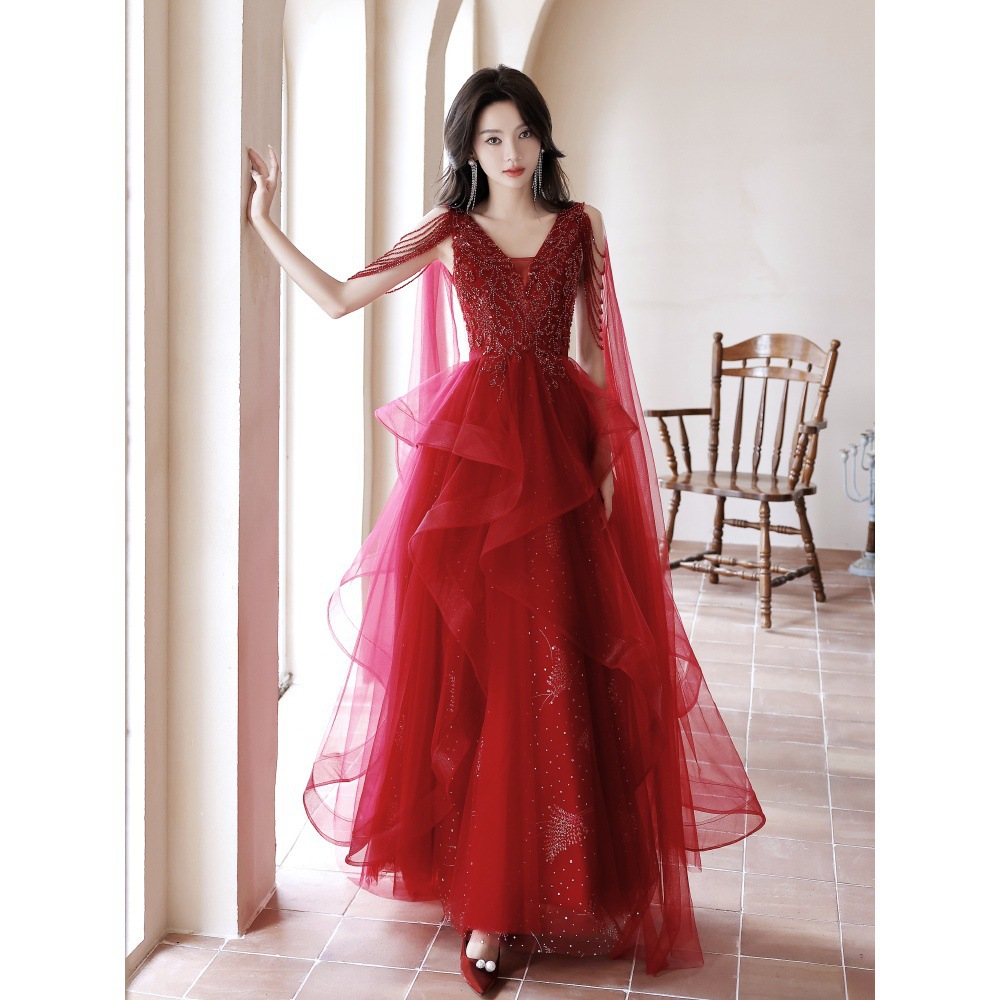 Evening Dress Female High-End Red Super Fairy Gauze Summer Host V Neck Toast Dress Bride High-End Main Wedding Dress