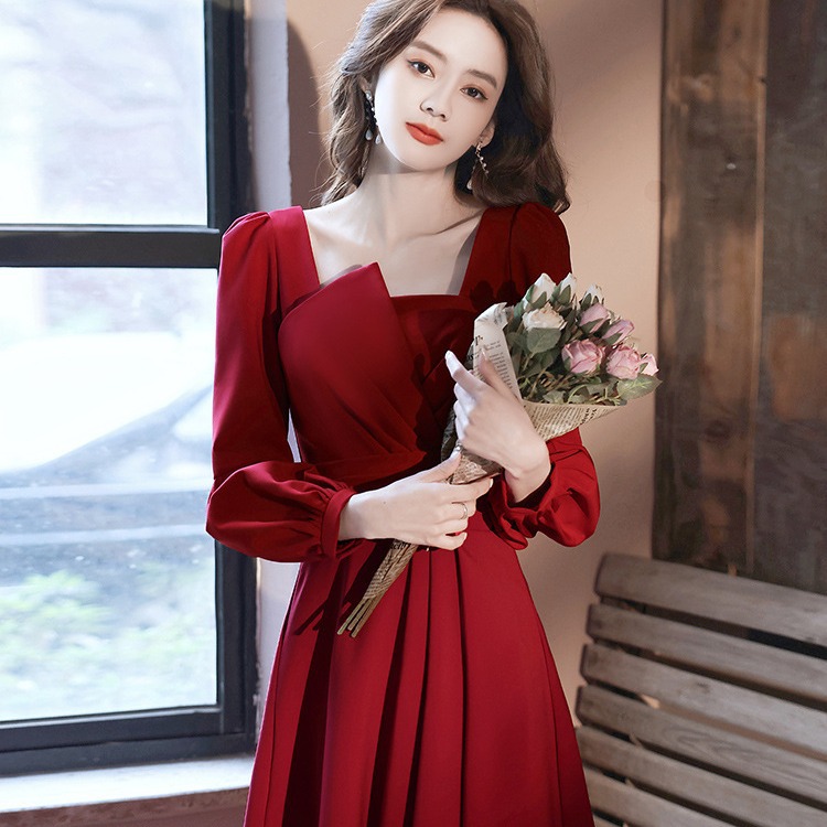 2025 New Autumn and Winter Wedding Dress for the Bride, Red Simple Long-Sleeved Engagement and Homecoming Dress