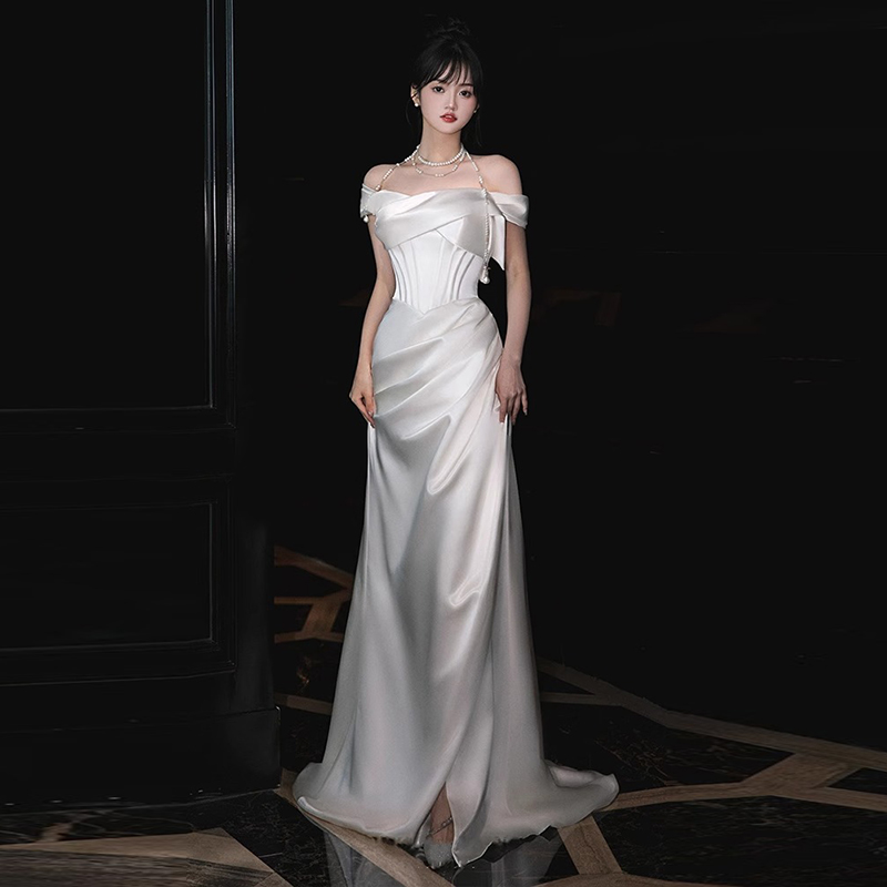 French Satin Off-Shoulder Light Wedding Dress, Bridal High-End White Niche Style Fishtail Reception and Departure Gown
