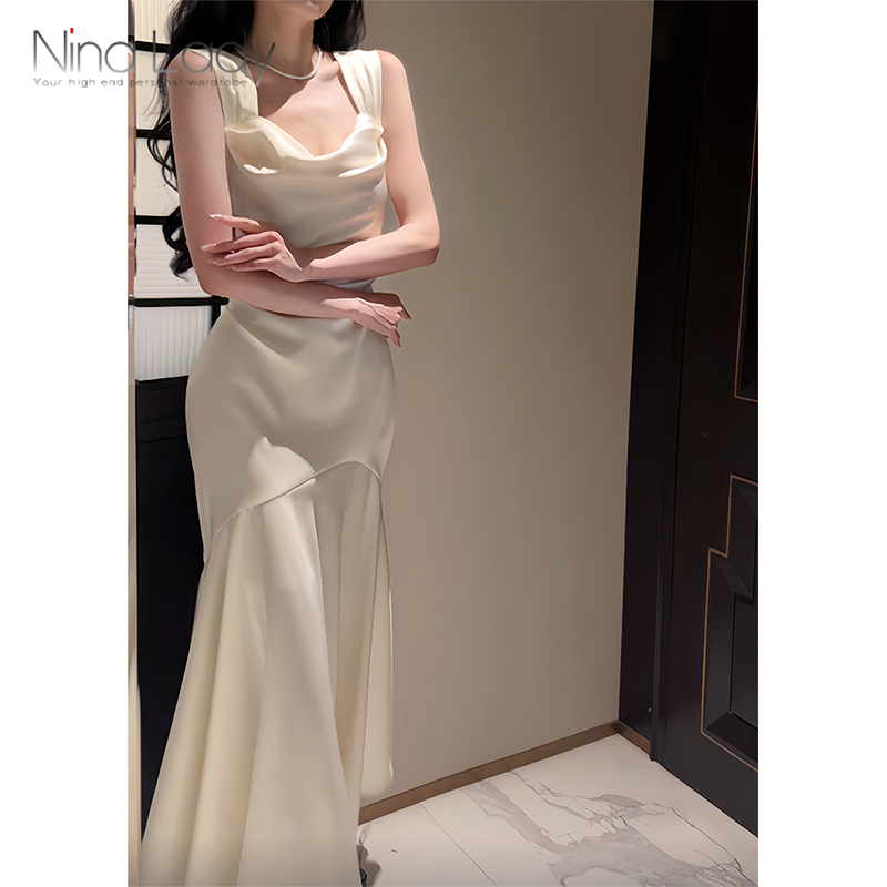 Ninalady French High-End White Square-Neck Satin Fishtail Dress Accessible Luxury Waist-Cinching Engagement Dress Long Dress