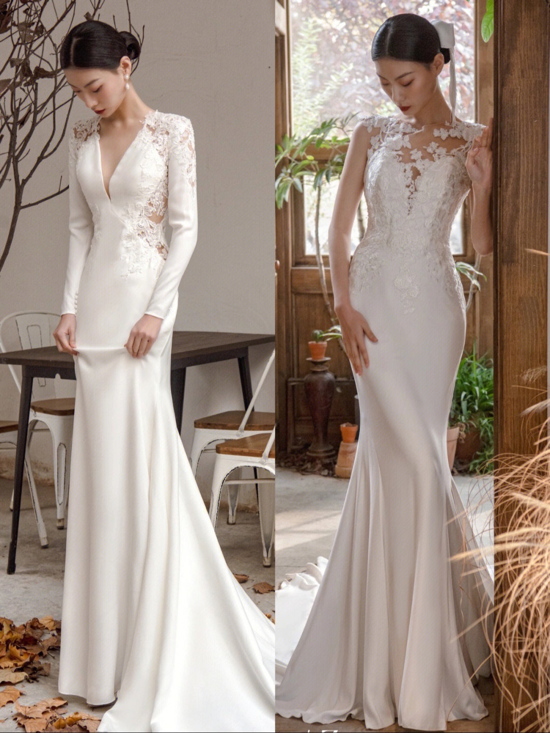 French-Style Light Wedding Dress with Long Sleeves, V-Neck, Satin Lace, Reception Dress, Fishtail Gown with Train, Slimming, Summer